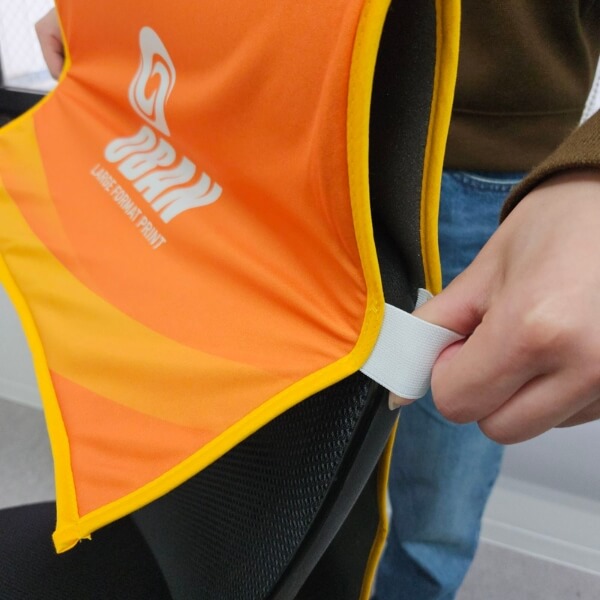 背幅がギリギリなことが分かるでしょうか。ゴムの伸縮でなんとか付けられましたが、かなりパツパツになっています。
