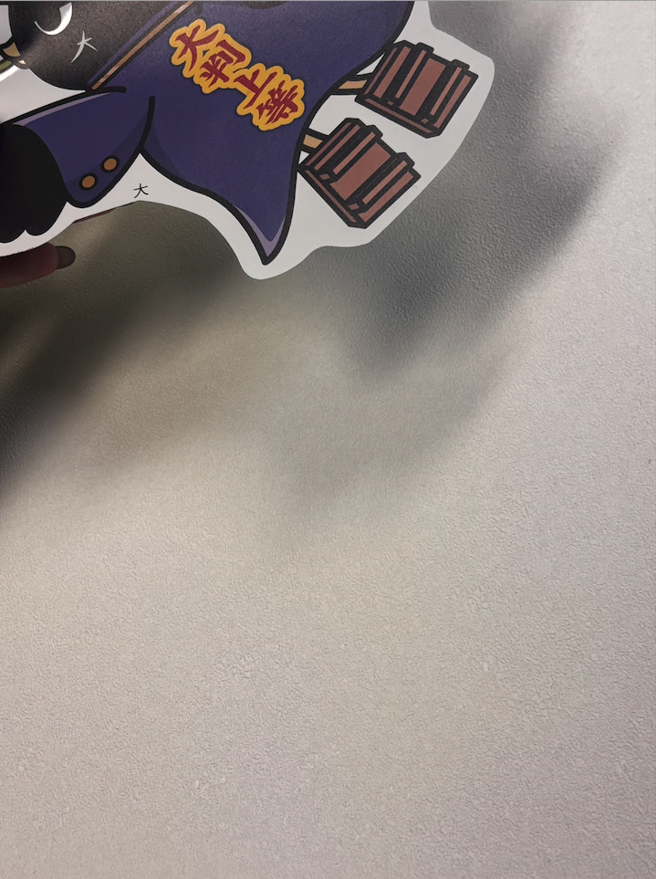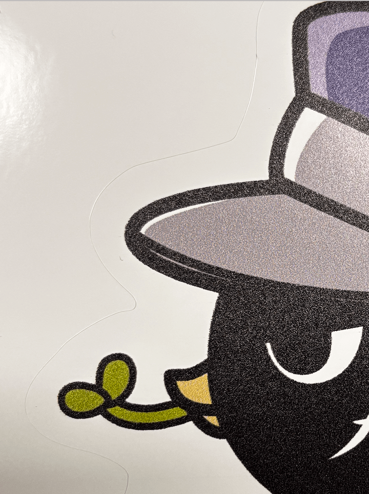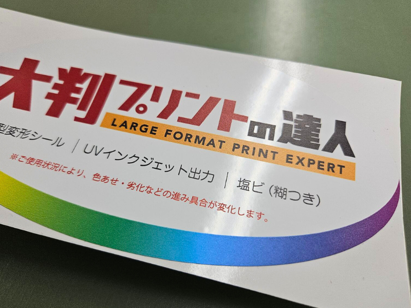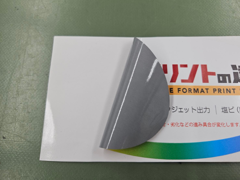 再剥離シールは大判ステッカーとは異なり光沢感は少なく、表面はさらさらとしたマットな質感です。印刷もマットな仕上がりのため、大判ステッカーほど印刷部分の違いは目立ちませんでした。