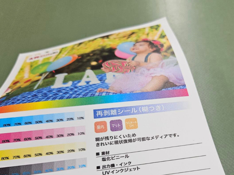 再剥離シールもUVインクジェット出力のため、近くで見たり手で触れると印刷されている場所とされていない場所の違いは感じました。